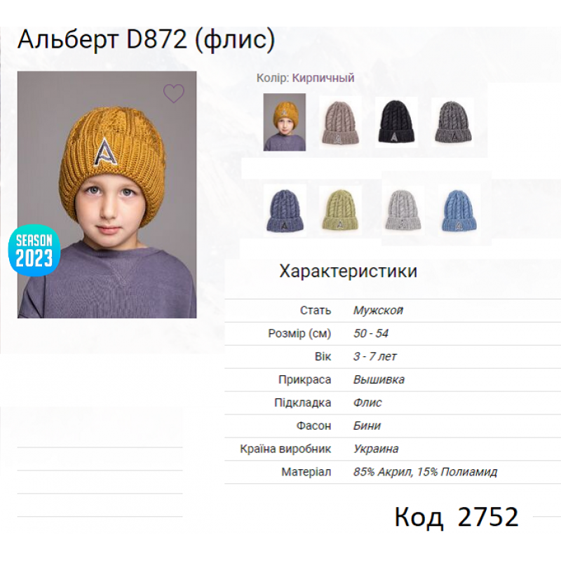 ALex Шапка в'язана на флісі для хлопчика АЛЬБЕРТ D872 50-54 5(4)шт.
