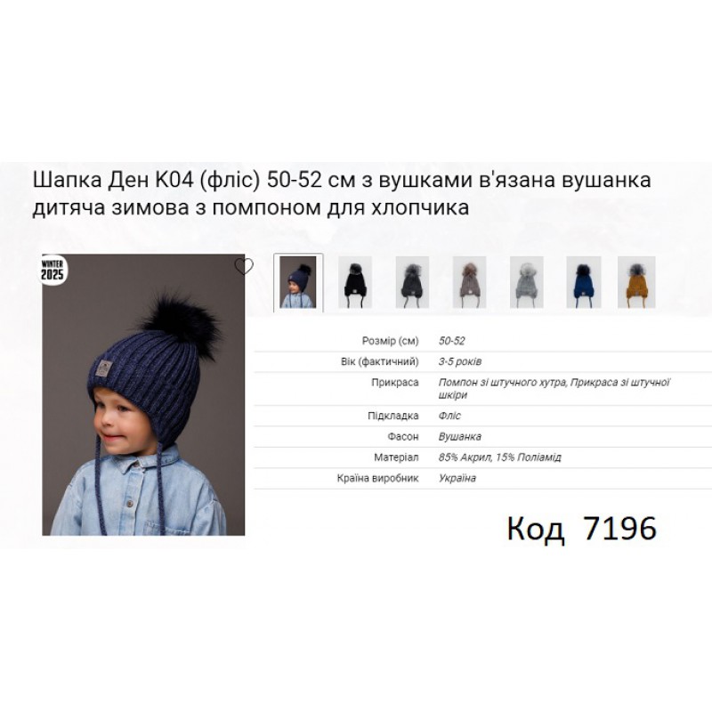 ALex Шапка в'язана на флісі для хлопчика (на зав'язках) ДЕН К04 50-52 5шт.