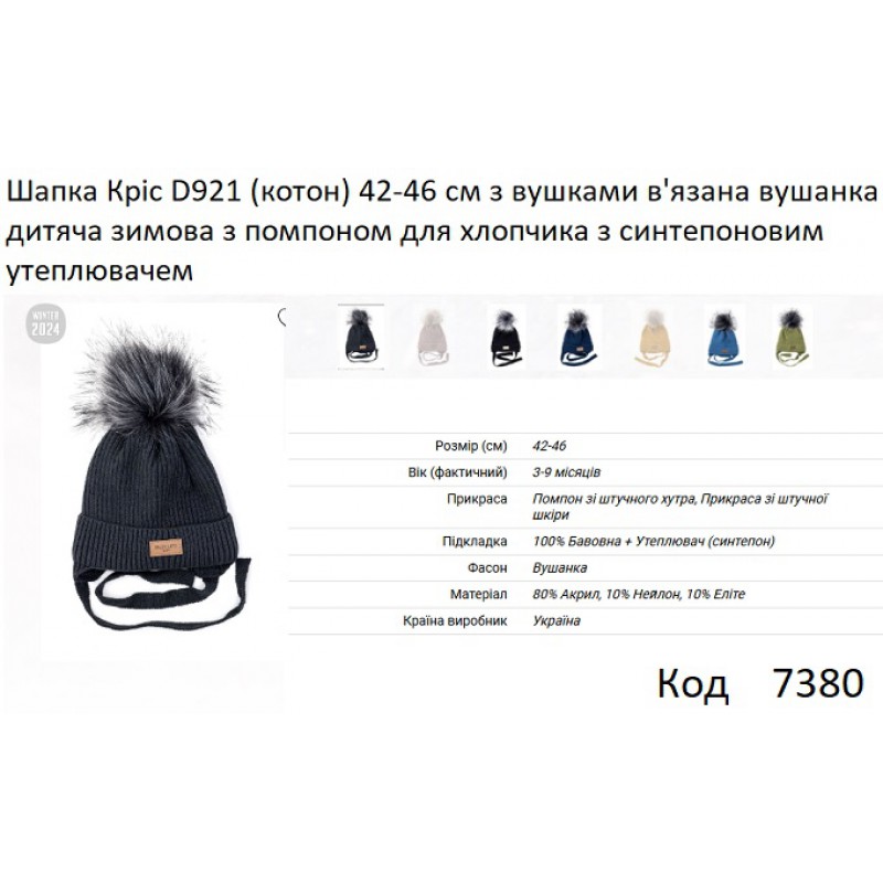 ALex Шапка в'язана синтепон на трикотажі для хлопчика (на зав'язках) КРІС D921 42-46 5шт.